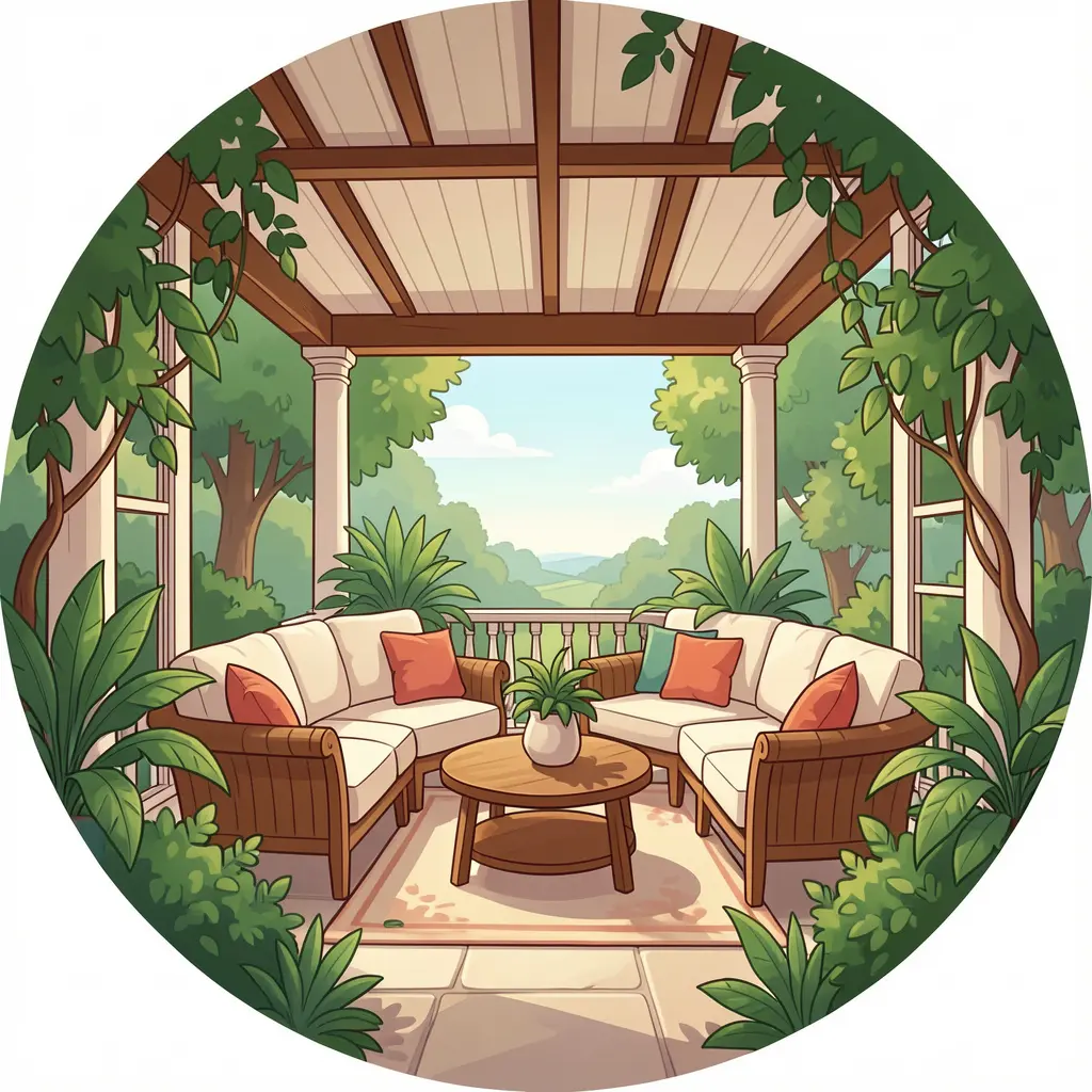 Cozy veranda setting with natural wood furniture and soft textiles